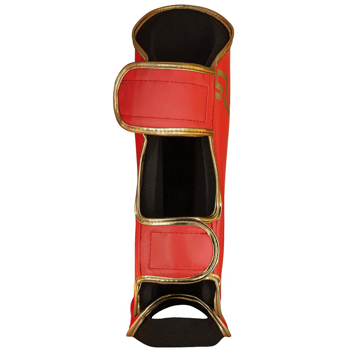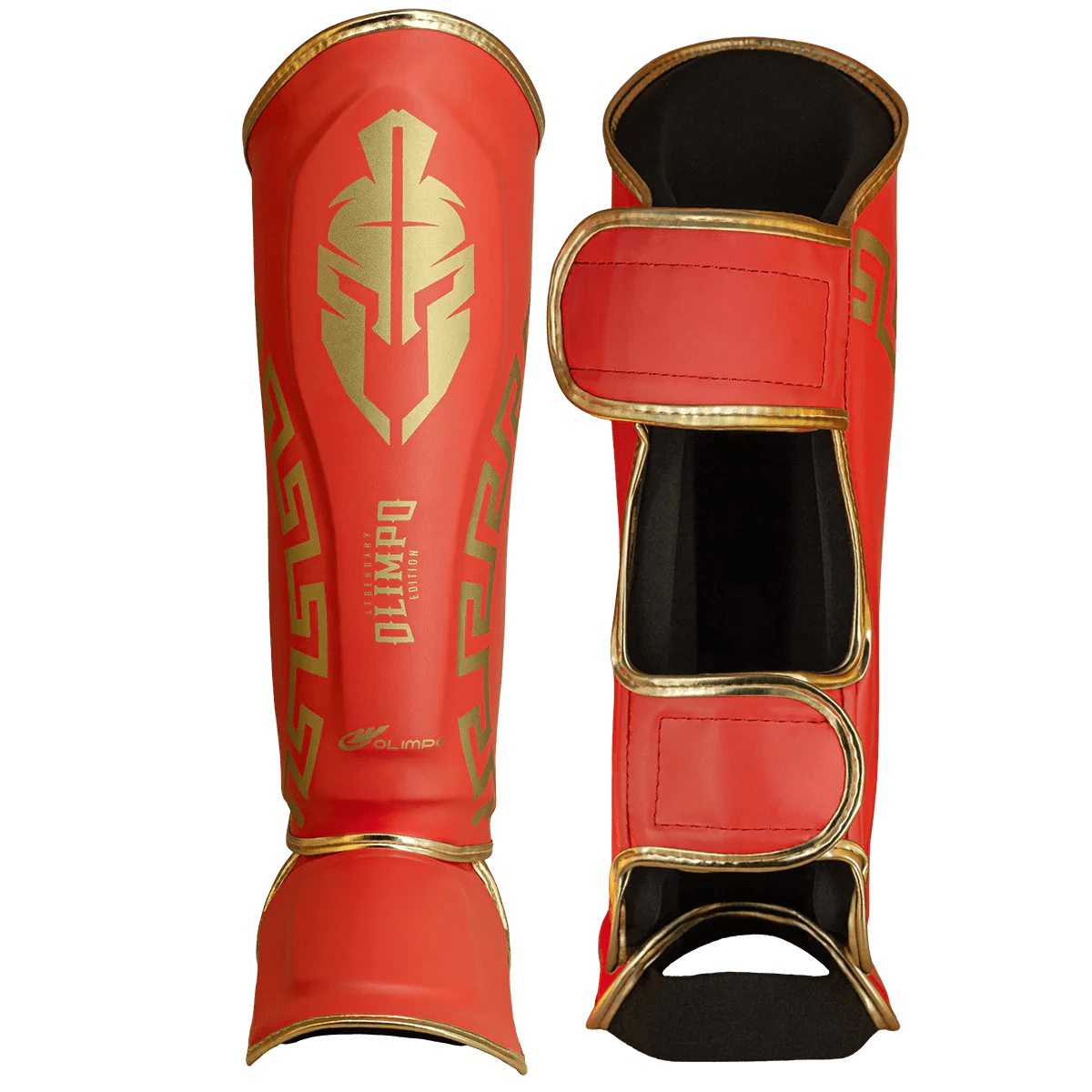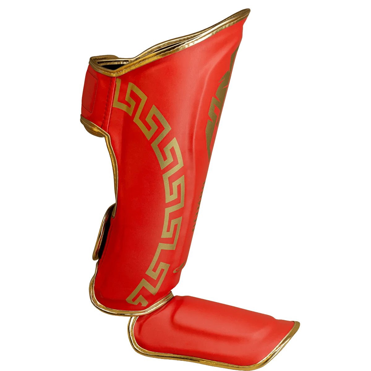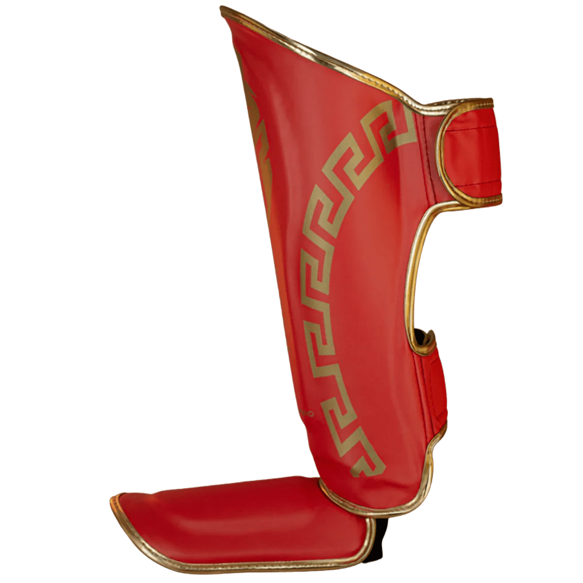 A estabilidade é garantida pelo sistema de velcro duplo de alta aderência, que impede que a caneleira gire na perna durante o combate. O acabamento em Vermelho com Dourado oferece um design moderno e intimidador.